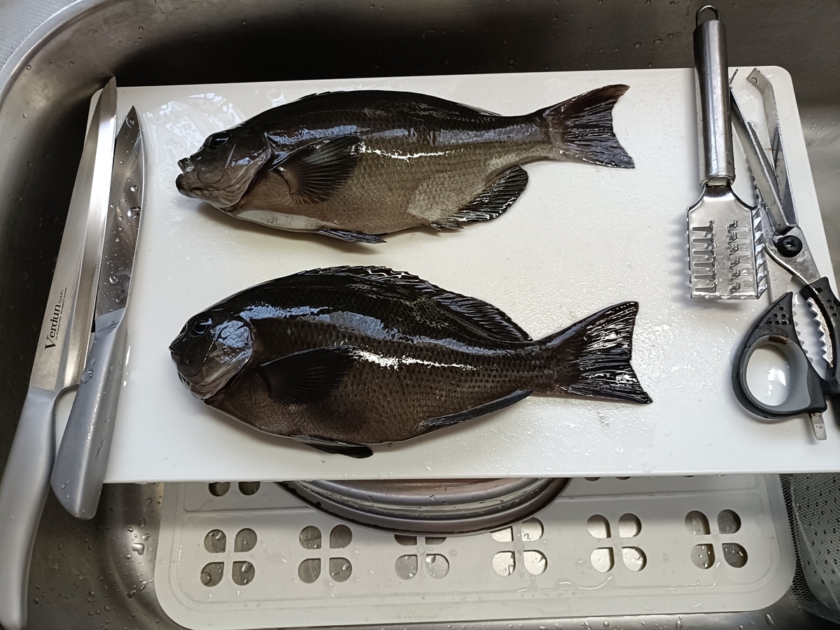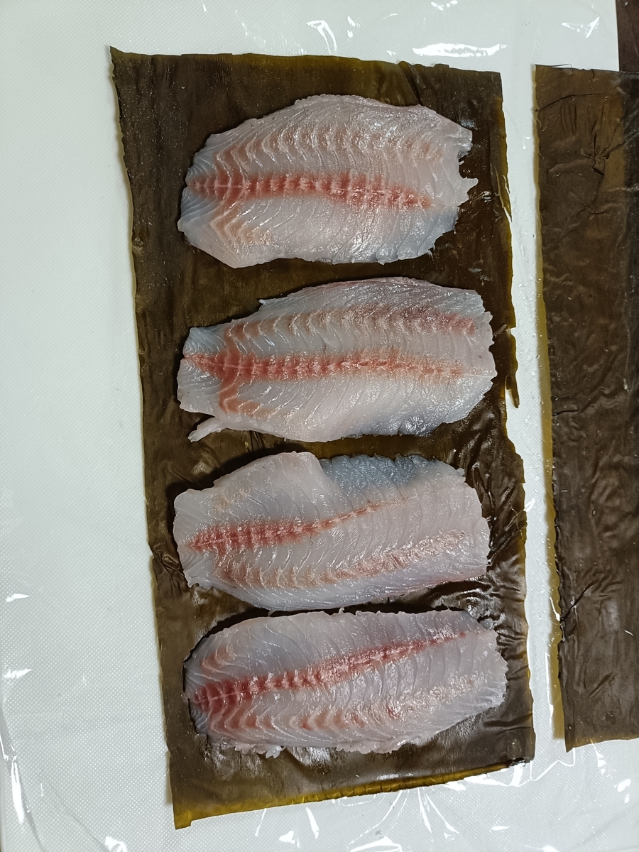 昨日釣って持ち帰ったコッパグレ、3匹は3枚におろしてムニエル用に、4匹は昆布じめにしました。